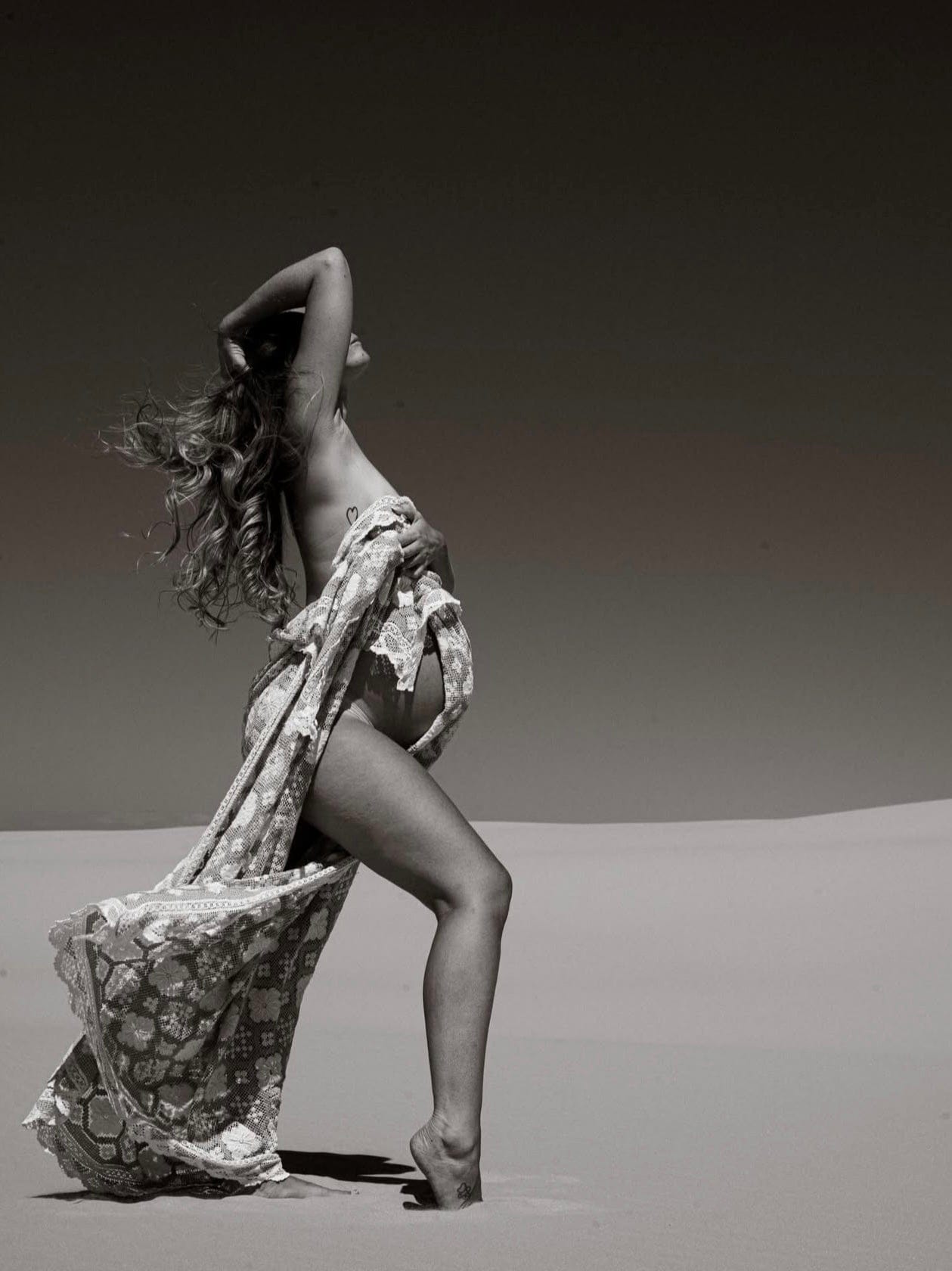 Capture the magic of golden hour with this vintage-inspired photoshoot outfit drape. Designed in soft beige and white tones, the lightweight fabric can be gently draped over your bump, allowing the delicate print to glow beautifully as sunlight filters through. The result is a dreamy pattern across the skin that highlights natural curves and creates an intimate, timeless maternity moment.