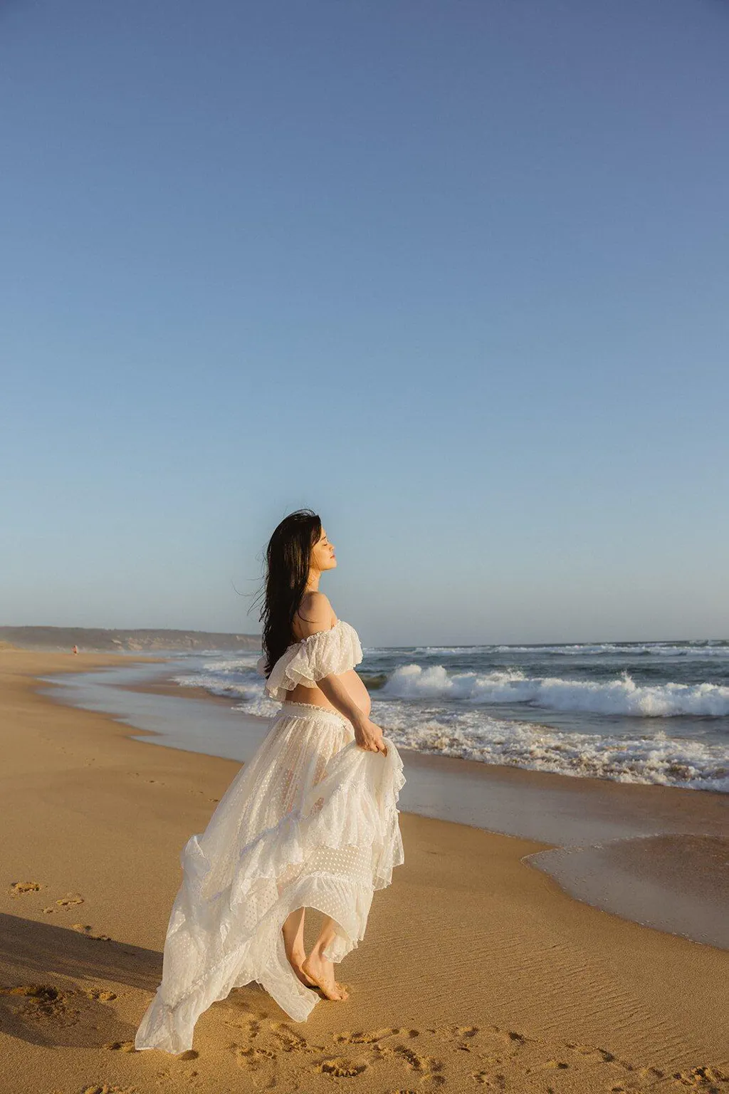 Our Kyndra two-piece maternity set is a delicately crafted set that is a dreamy delight. Made from a soft white polka dot soft tulle that flatters everyone.