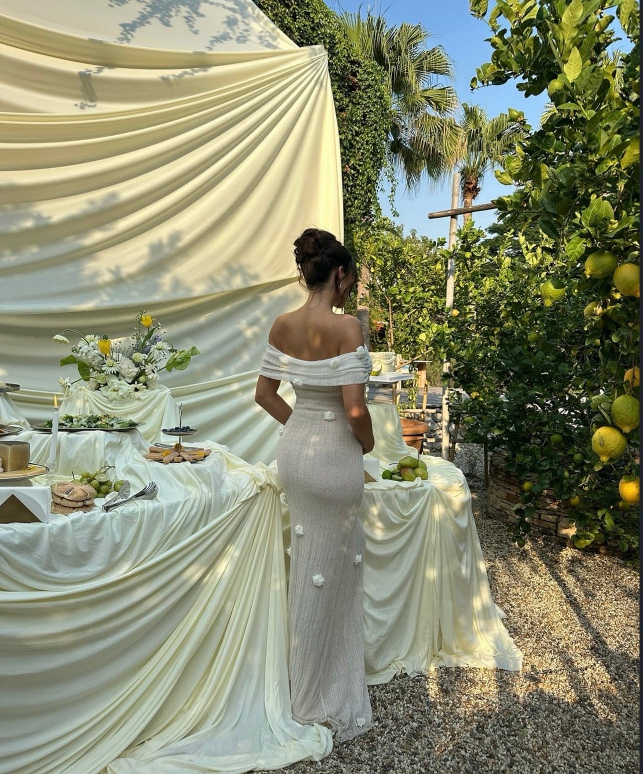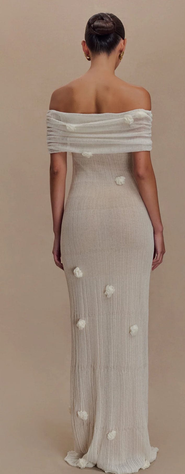 The Meshki Orchid Knit maxi Dress is a romantic choice, ideal for photoshoots, baby showers, bridal events and all types of special occasions